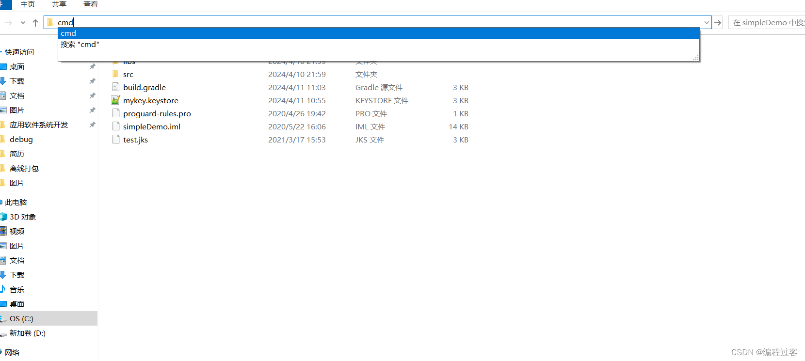 进入到simpleDemo项目目录里输入cmd打开命令面板: