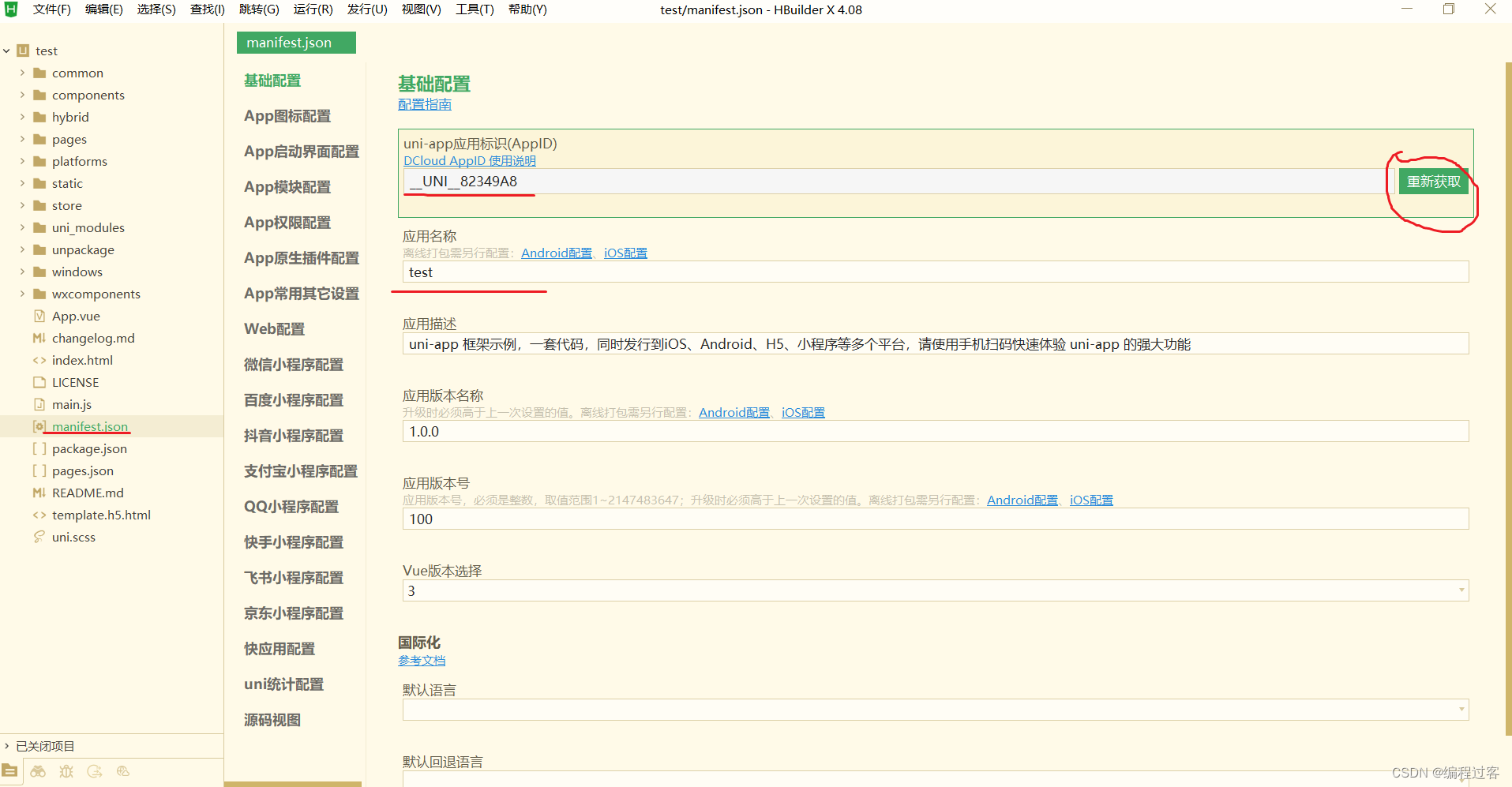 将Uniapp项目使用HbuilderX打开后点击manifest.json文件做以下配置,其中名称与ID是必填的,对于ID需要使用账号登录HbuilderX后才能获取