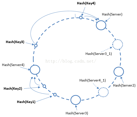 一致性哈希算法能有效降低服务器个数变化对整体缓存的影响,基本实现原理是将Hash函数的值域空间组织成一个圆环,将服务器节点进行哈希,并将哈希结果映射到圆环上,当有一个写入缓存的请求到来时,使用相同的Hash函数,计算Key的哈希值在圆环上对应的位置,按顺时针方向,将请求定位至离其最近的服务器节点