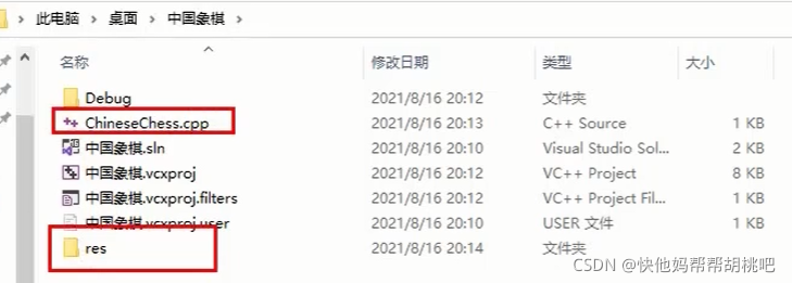 任何游戏的开始都是创建一个项目,并将准备好的素材资源放到同级目录下(素材及音乐可以在文章最下方领取)如图(这里就用上篇中国象棋实例):