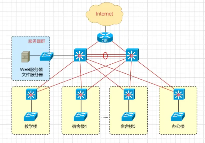 核心层:主要部署路由器设备,用于连接外网线路,还要具备冗余能力