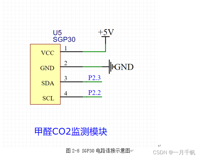 SGP30传感器是一种用于检测室内空气质量的传感器。它基于独特的电化学技术,可以测量二氧化碳(CO2)和可挥发性有机化合物(VOC)的浓度。SGP30传感器的工作原理是利用化学反应来测量气体浓度。传感器内部有一个电化学电池,其中包含一层气敏材料。当空气中的气体进入传感器并与气敏材料接触时,气体分子会在材料表面发生化学反应。这些反应会引起电化学电池中的电流变化,从而使传感器能够测量气体浓度。SGP30传感器通过电化学反应来测量室内空气中CO2和VOC的浓度,具有高精度、快速响应、低功耗、小巧便携和低成本等优势。电路图如图2-8所示: