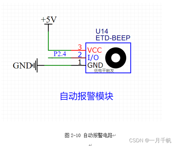 本设计使用有源蜂鸣器声音报警,当单片机的P2.4口输出低电平时,蜂鸣器便发出声音报警,当单片机的P2.4口输出高电平时,声音报警停止工作。其具有报警功能的数据模块分别为天然气浓度监测模块、PM2.5粉尘浓度监测模块和甲醛二氧化碳浓度监测模块,报警阈值由程序设置控制。报警模块电路图如图2-10所示: