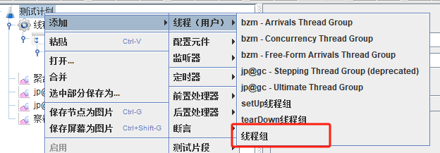 在线程组的添加位置在测试计划下,具体操作路径为:测试计划 → 添加 → 线程组。在添加时,还可以看到多种类型的线程组可供选择,如 bzm-Arrivals Thread Group、bzm-Concurrency Thread Group 等 ,一般选择默认的线程组类型即可满足基本测试需求。