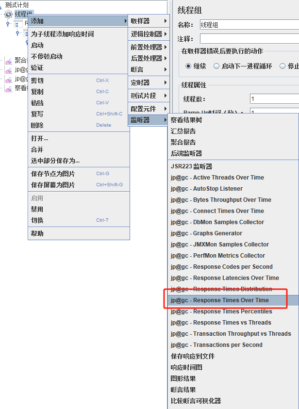 jp@gc - Response Times Over Time 的添加位置在测试计划 → 监听器下,操作路径为:测试计划 → 添加 → 监听器 → jp@gc - Response Times Over Time。