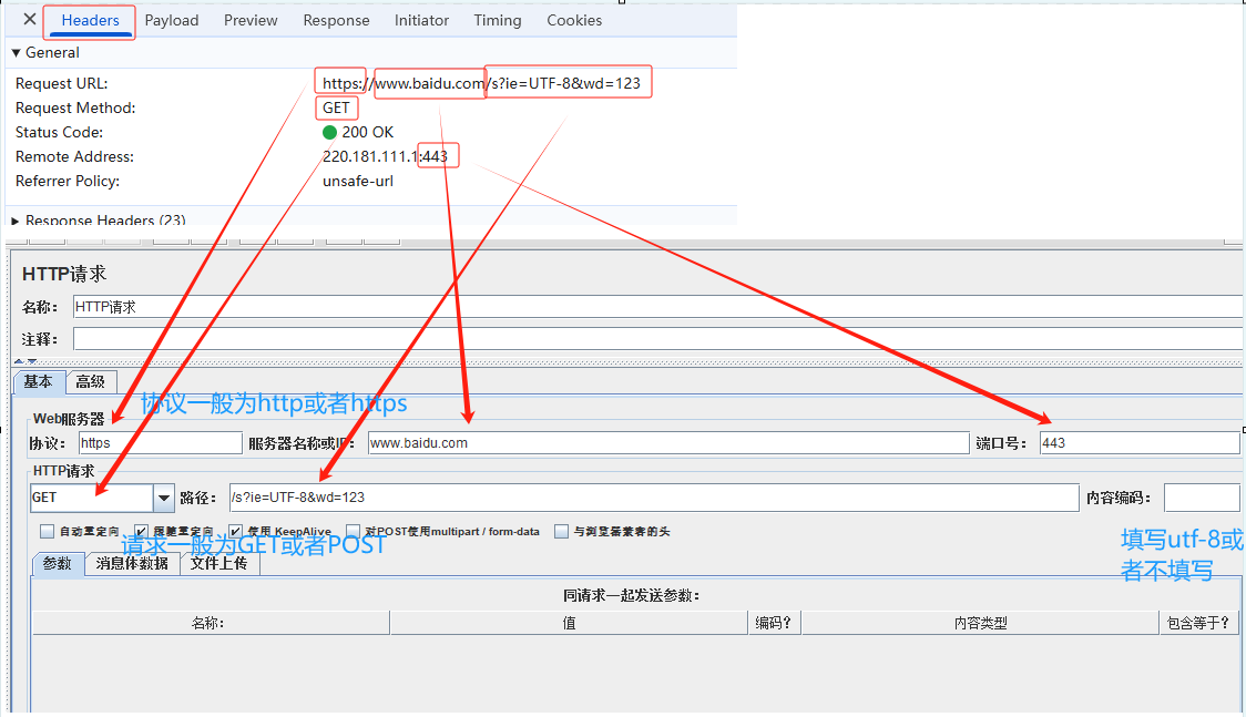 - 协议:一般为 http 或者 https,根据目标服务器的实际情况选择,例如百度搜索使用的是 https 协议。