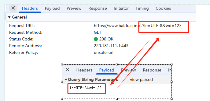 - 路径:即请求 URL 中除去协议、服务器名称和端口号后的部分,例如百度搜索的路径可能是 “/s?ie=UTF-8&wd=123” ,其中 “ie=UTF-8&wd=123” 是传递的参数。