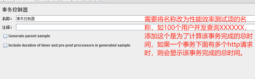 - 名称:需要修改为性能效率测试项的具体名称,比如 “100 个用户并发查询 XXXXXX” ,这样便于清晰地识别该事务代表的测试场景,同时也方便在后续的测试结果分析中快速定位和查看相关数据。