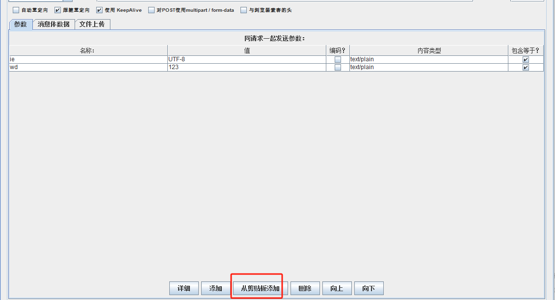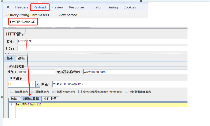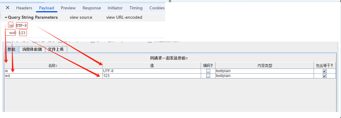 从浏览器开发者工具在Payload里面这个数据粘贴到消息体数据内,一般需要将数据转换成 join 字符串格式。例如,获取到的参数为 “ie=UTF-8&wd=123”,则将其粘贴到消息体数据中。