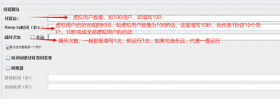 - Ramp-Up 时间(秒):指虚拟用户启动完成的时间。假设虚拟用户数量为 100,Ramp-Up 时间设置为 10 秒,那么意味着每秒启动 10 个用户,10 秒完成全部 100 个虚拟用户的启动。