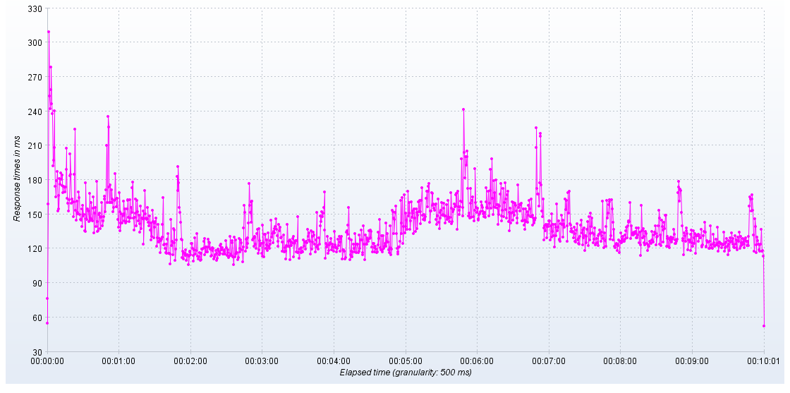 jp@gc - Response Times Over Time 组件主要用于以折线图的形式展示事务的响应时间随时间的变化情况,让测试人员直观地观察到在整个测试过程中响应时间的波动趋势。