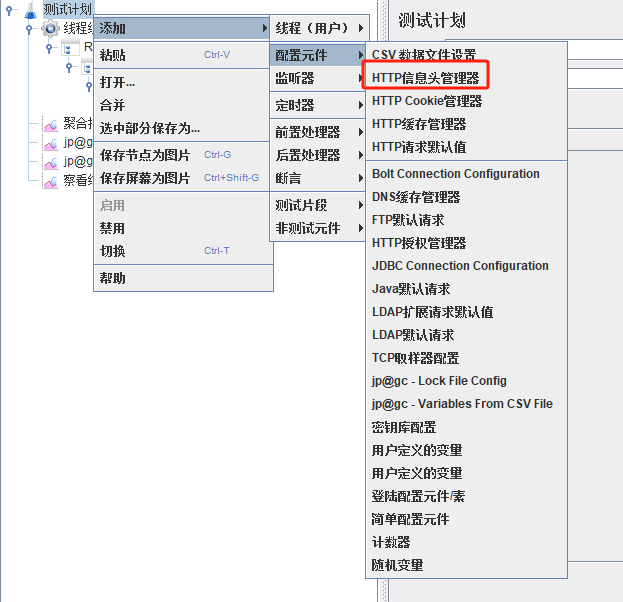 HTTP 信息头管理器的添加位置在测试计划 → 配置元件下,操作路径为:测试计划 → 添加 → 配置元件 → HTTP 信息头管理器。