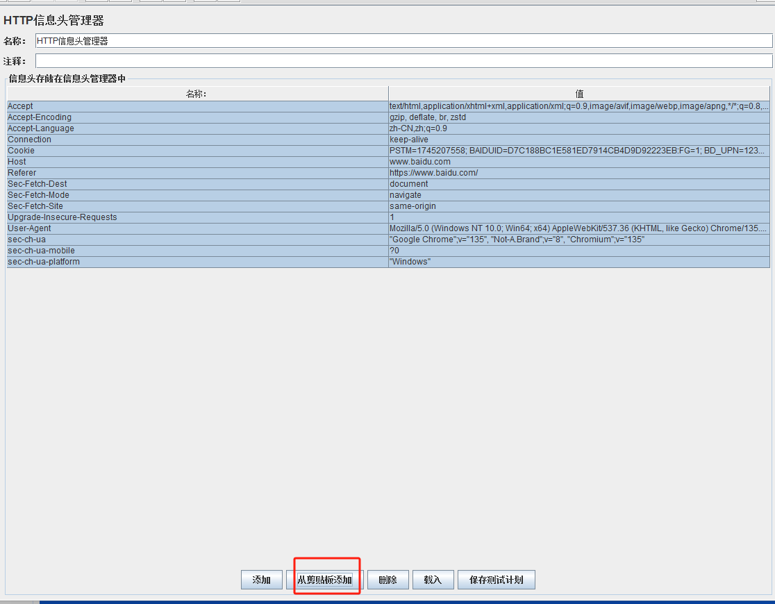 配置 HTTP 信息头管理器时,从浏览器开发者工具的 “Headers” 中复制 “Request Headers” 部分的内容(注意不要复制第一行)。然后在 Jmeter 的 HTTP 信息头管理器中,点击 “从剪贴板添加”,即可完成信息头的添加。例如,复制的部分信息如下: