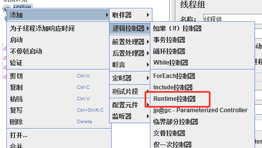 Runtime 控制器的添加位置在测试计划 → 线程组下,具体操作路径为:测试计划 → 线程组 → 添加 → 逻辑控制器 → Runtime 控制器。