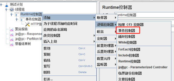 事务控制器的添加位置在测试计划 → 线程组 → Runtime 控制器下(若有 Runtime 控制器),操作路径为:测试计划 → 线程组 → [Runtime 控制器] → 添加 → 逻辑控制器 → 事务控制器。