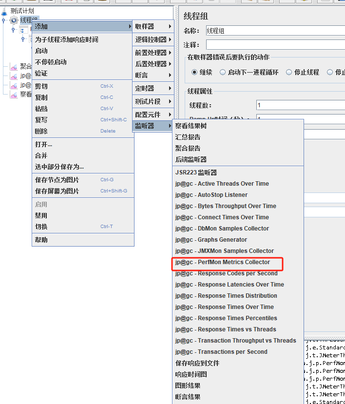 jp@gc - PerfMon Metrics Collector 的添加位置在测试计划 → 监听器下,操作路径为:测试计划 → 添加 → 监听器 → jp@gc - PerfMon Metrics Collector。