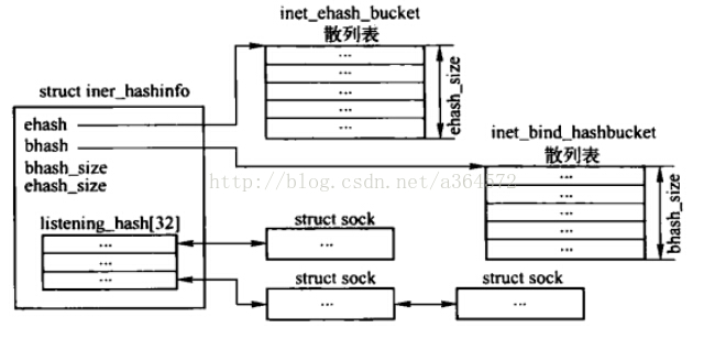 struct hlist_head listening_hash[INET_LHTABLE_SIZE] //listen状态的tcp_sock<span style="font-family: Arial, Helvetica, sans-serif;">散列表</span>