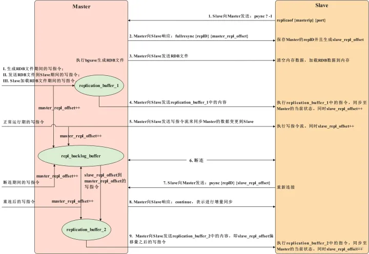 有了上述两点认识,现在思考一个问题:主节点和从节点如果因为某些原因,断开了连接,而断开连接这段时间里主节点又处理了一些写指令,那么从节点重新连接后,应该怎么将断开连接那段时间里的写指令同步给重连的从节点?通常的想法就是再执行一次全量同步,在2.8之前的版本,确实是这么实现的,但从2.8版本开始,引入了增量同步,具体的实现如下。