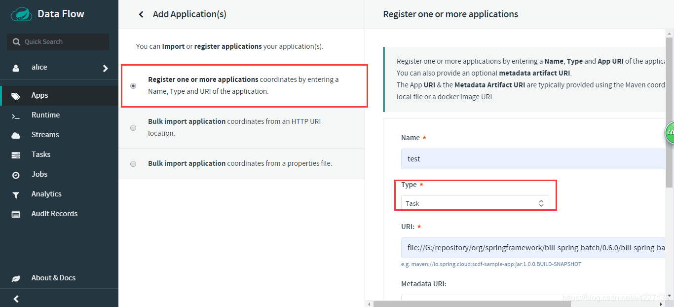 注册就是让Data Flow知道在哪能找到jar,可以用maven或file的方式,以file方式为例。