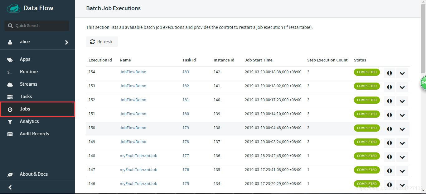 其中Jobs就是监控Spring Batch的地方。当然,Spring Batch首先要做Spring Cloud Task改造之后,才能在这里显示,单纯的Spring Batch启动的job是无法被Data Flow监控的。