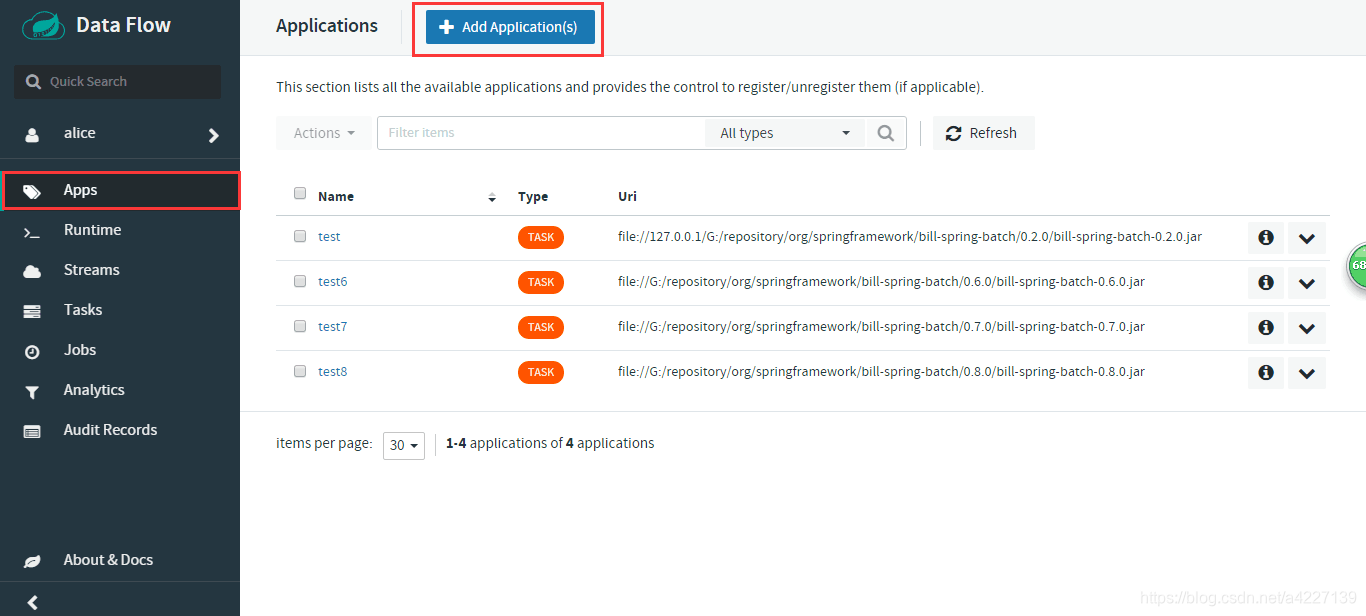 Data Flow的Dashboard页面虽然可以监控、重启、停止 Spring Batch,但需要注意的是它主要的管理对象是 Spring Cloud Stream和 Spring Cloud Task,关于Spring Batch的监控只是它的一部分内容,而且对Spring Batch的监控、重启、停止,本质上是对Spring Cloud Task的的监控、重启、停止。