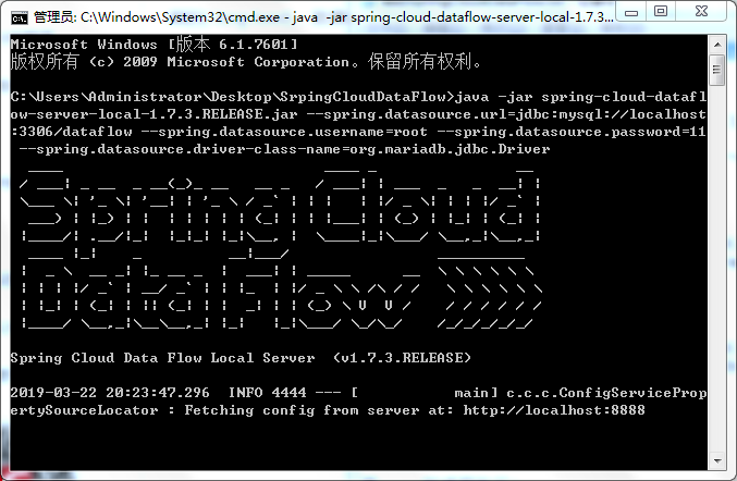 从官网https://cloud.spring.io/spring-cloud-dataflow/ 下载jar包后(我下载的是1.7版本),打开命令行,进入jar包所在的目录,键入命令java -jar spring-cloud-dataflow-server-local-1.7.3.RELEASE.jar --spring.datasource.url=jdbc:mysql://localhost:3306/dataflow --spring.datasource.username=root --spring.datasource.password=123456 --spring.datasource.driver-class-name=org.mariadb.jdbc.Driver