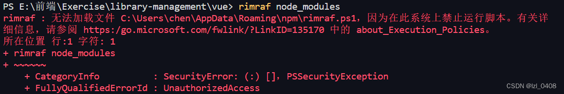 这里我运行的时候报错:rimraf : 无法加载文件 C:\Users\chen\AppData\Roaming\npm\rimraf.ps1,因为在此系统上禁止运行脚本。