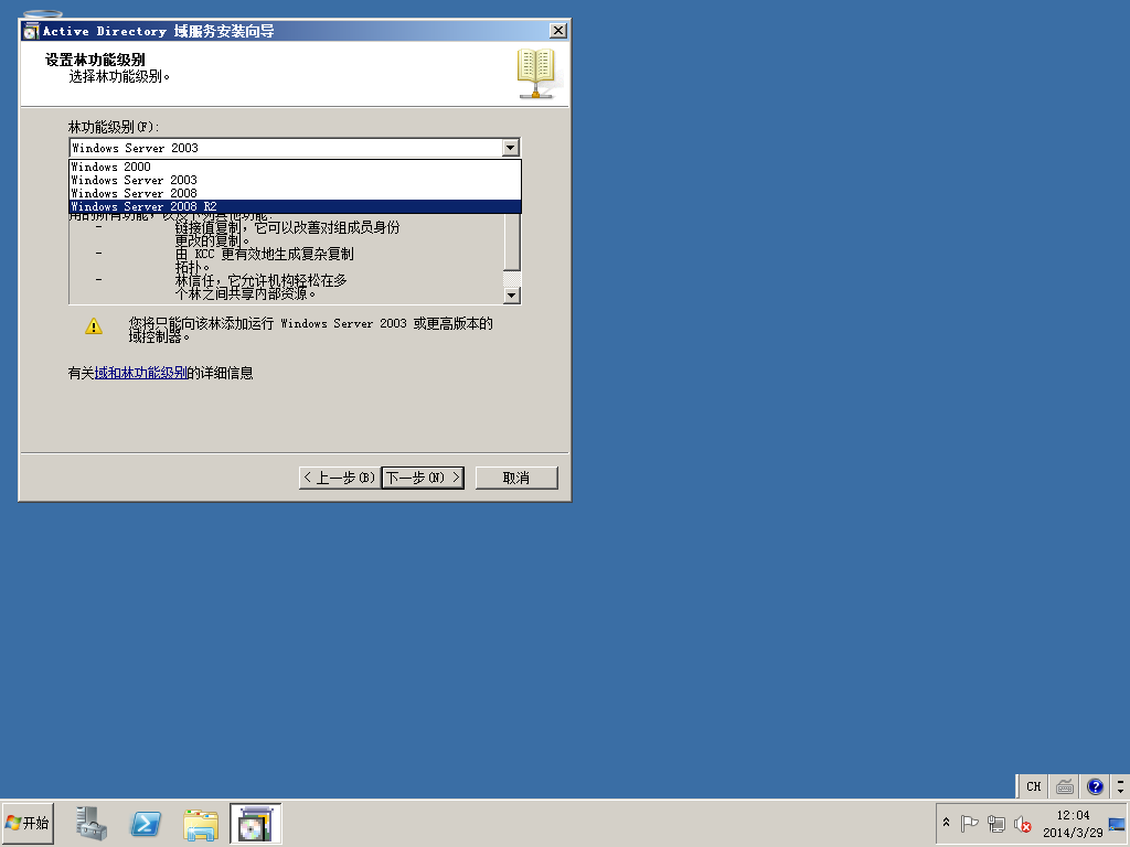 7)选择林功能级别:Windows Server 2008 R2