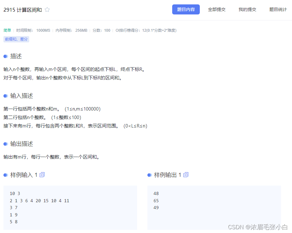 2024年寒假算法班集训day05-知识总结及题解(前缀和与差分) 具体方法是先计算出数组的前缀和数组,其中第i个元素是原数组前i个元素的和。例如,想要求原数组中从第l个到第r个元素的区间和,只需要用前缀和数组的第r个元素减去第l-1个元素的前缀和即可。这里s[L-1]代表的是数组a的第1个元素到第L-1个元素的和,而s[R]代表的是数组a的第1个元素到第R个元素的和。接下来,对于每次操作,更新差分数组,并在所有操作结束后,通过差分数组还原最终的杯子水量数组,最后输出每个杯子中的水量。这里的区间和指的是在一个数组中,从第 x 个元素到第 y 个元素的所有数的和。