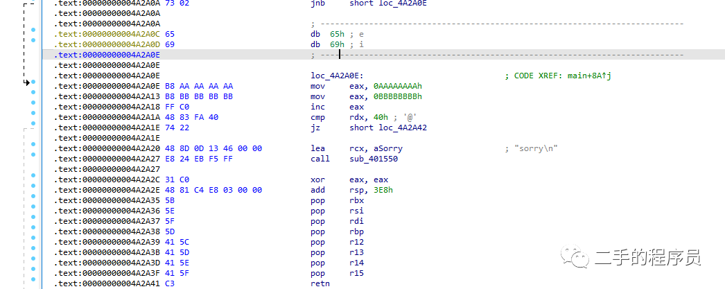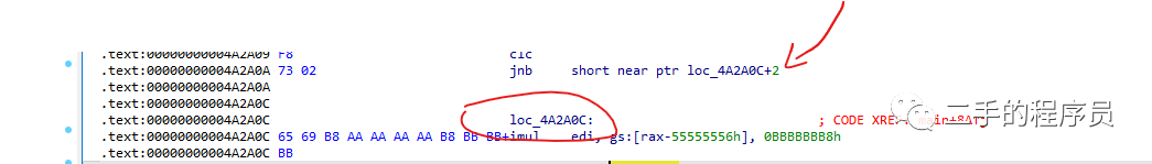 这里有个跳转到loc_4A2A0C + 2 的位置,这就有点奇怪了。下面是 loc_4A2A0C 相当于是一个地址标识 X ,上面跳转到 X + 2,那岂不是有两条无用的指令。