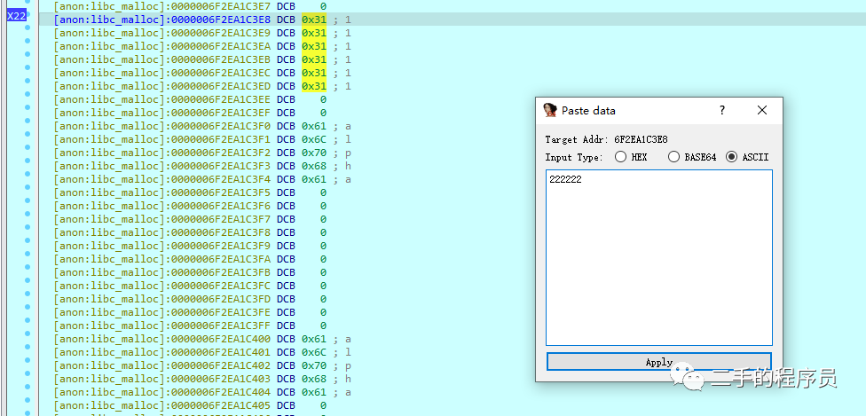 右键选择 paste data,在弹出的窗口里面输入 “222222”,注意选择 ASCII,这样我们输入的就是字符: