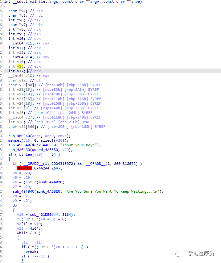 我们发现函数里面有个 if,其条件是长度要是 64,在这里断点一下,随便输入一个字符串”1313143”,发现 v20 就是我们输入的字符串,说明我们输入的字符串必须要是64位长度: