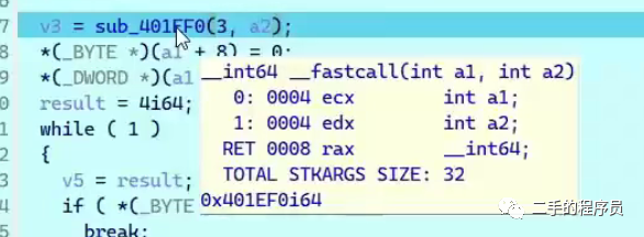 ecx 存的是第一个参数,那么哪个寄存器是第二个参数呢?我们将鼠标指针放到调用的函数上,IDA会给出提示: