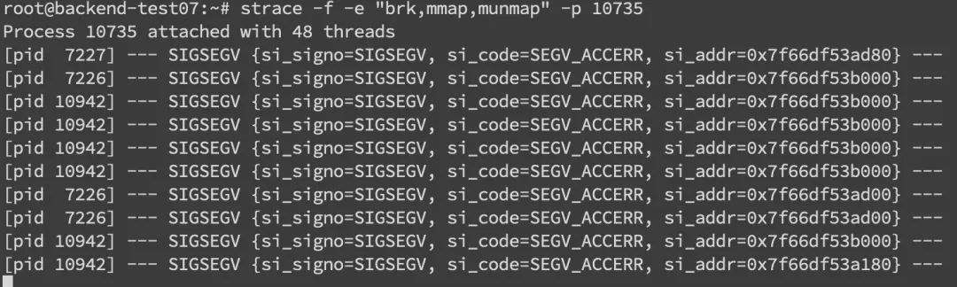 此外在系统层面,我们还可以使用strace命令来监控内存分配 strace -f -e "brk,mmap,munmap" -p pid
