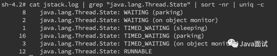 当然更常见的是我们对整个jstack文件进行分析,通常我们会比较关注WAITING和TIMED_WAITING的部分,BLOCKED就不用说了。我们可以使用命令cat jstack.log | grep "java.lang.Thread.State" | sort -nr | uniq -c