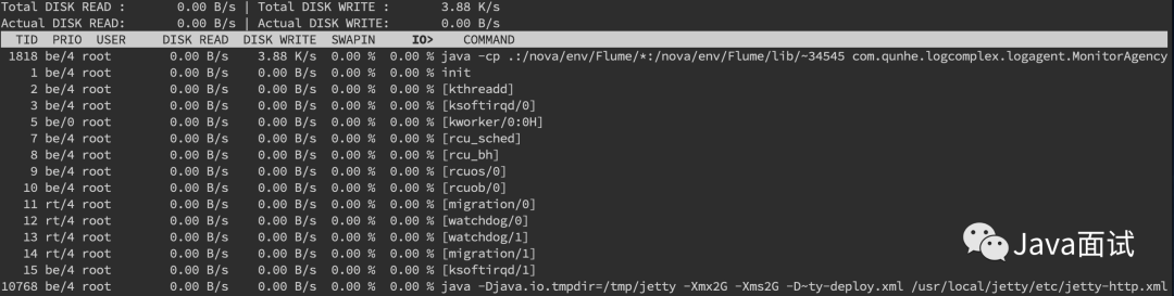 另外我们还需要知道是哪个进程在进行读写,一般来说开发自己心里有数,或者用iotop