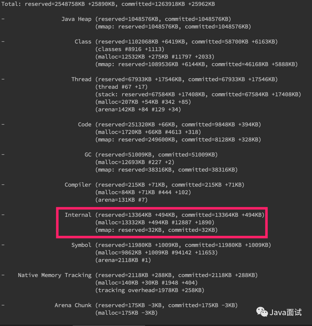 做一下summary或者detail级别的diff。可以看到jcmd分析出来的内存十分详细,包括堆内、线程以及gc(所以上述其他内存异常其实都可以用nmt来分析),这边堆外内存我们重点关注Internal的内存增长,如果增长十分明显的话那就是有问题了。detail级别的话还会有具体内存段的增长情况,如下图。