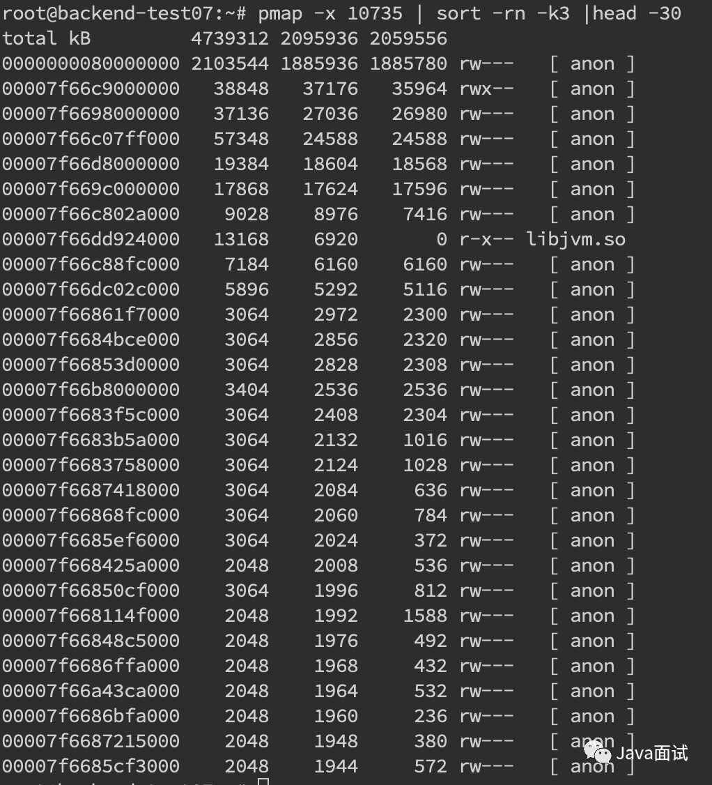 堆外内存溢出往往是和NIO的使用相关,一般我们先通过pmap来查看下进程占用的内存情况pmap -x pid | sort -rn -k3 | head -30