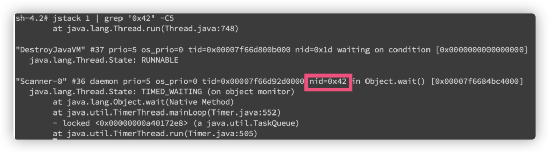 接着直接在jstack中找到相应的堆栈信息jstack pid |grep 'nid' -C5 –color