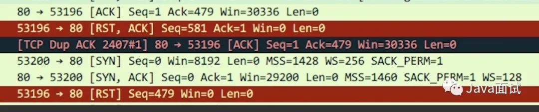 接下来我们通过wireshark打开抓到的包,可能就能看到如下图所示,红色的就表示RST包了。