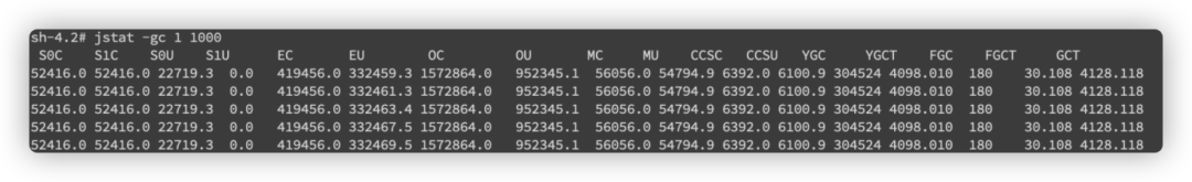 命令来对gc分代变化情况进行观察,1000表示采样间隔(ms),S0C/S1C、S0U/S1U、EC/EU、OC/OU、MC/MU分别代表两个Survivor区、Eden区、老年代、元数据区的容量和使用量。YGC/YGT、FGC/FGCT、GCT则代表YoungGc、FullGc的耗时和次数以及总耗时。如果看到gc比较频繁,再针对gc方面做进一步分析。