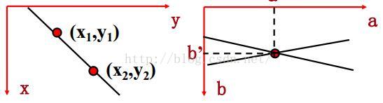 2、过xy平面一个点(x,y)的所有直线,构成参数ab平面上的一条直线。
