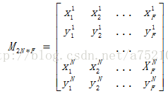 每一列对应的是一帧中的特征点的x、y坐标,下标为第i帧,上标为第i个特征点,一共F帧图像,每帧图像取N个特征点。