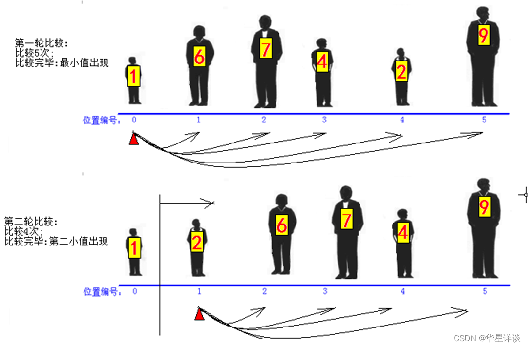 第一轮从arr[0]和后面元素相比较,第二轮从arr[1]和后面的元素相比较,依次类推。N个数要进行N-1轮。选择排序每一轮只进行一次交换,相对于冒泡排序效率高一些。
