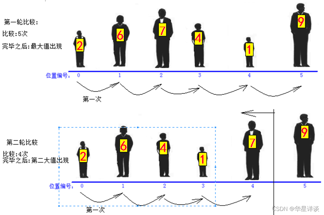 可以看出若有N个元素,那么一共要进行N-1轮比较,第M轮要进行N-M次比较。(若6个元素,要进行6-1轮比较,第一轮比较6-1次,第三轮比较6-3次)。