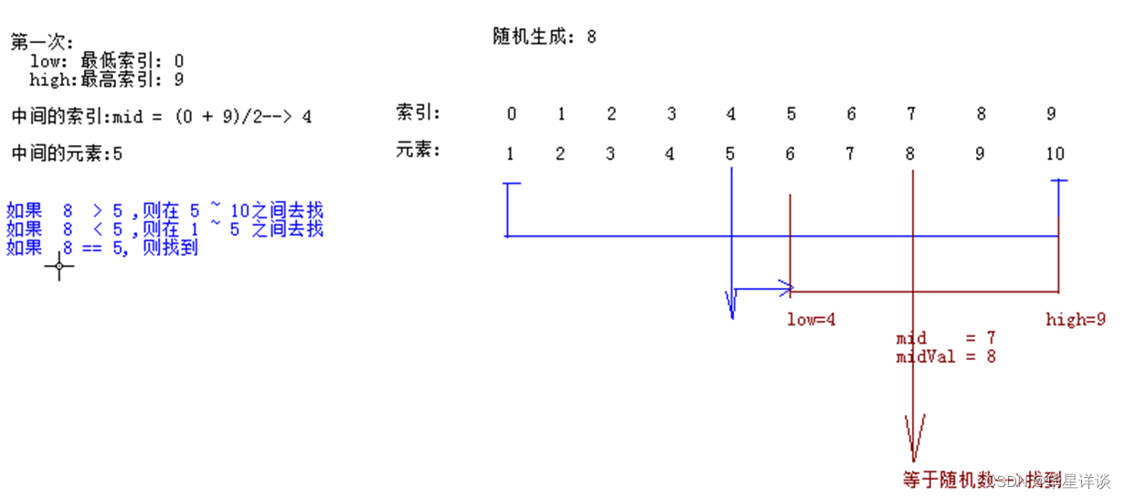 前提:数组元素必须有顺序,当数据量很大时适宜采用该方法。采用二分法查找时,数据需是排好序的。
