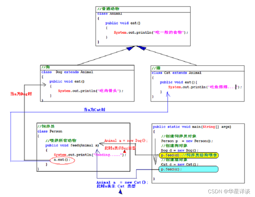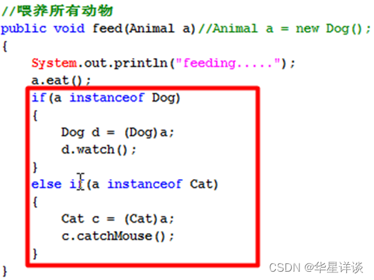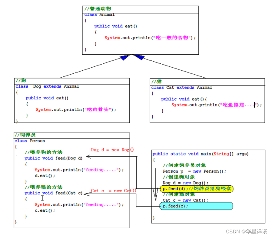 以上这种实现方式不优雅。那能不能只提供一个方法,就能统一喂养所有动物?这个时候就要靠多态来实现了。