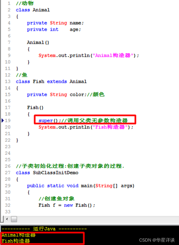 在创建子类对象之前,会先创建父类对象。调用子类构造器之前,在子类构造器中会先调用父类的构造器,默认调用的是父类无参数构造器。我们通过以下的例子的class文件就可以得出该结论。