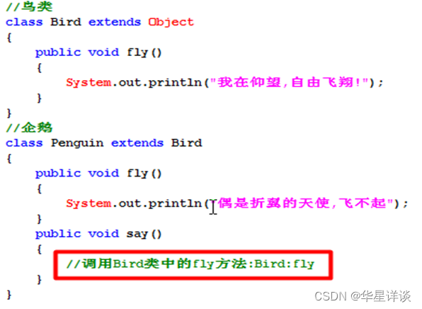比如企鹅(Penguin)和鸵鸟(Ostrich)是鸟类中的一个特殊品种,所以企鹅/鸵鸟类是鸟类的一个子类。但是鸟类有飞翔的功能,可是对于企鹅/鸵鸟来说,飞翔的行为显然不适合于它。此时肿么办呢?这时就该方法覆盖出场了。