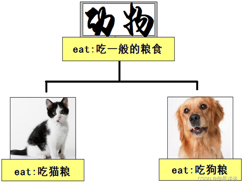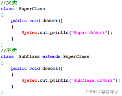 作用:解决子类继承父类之后,可能父类的某一个方法不满足子类的具体特征,此时需要重新在子类中定义该方法,并重写方法体。